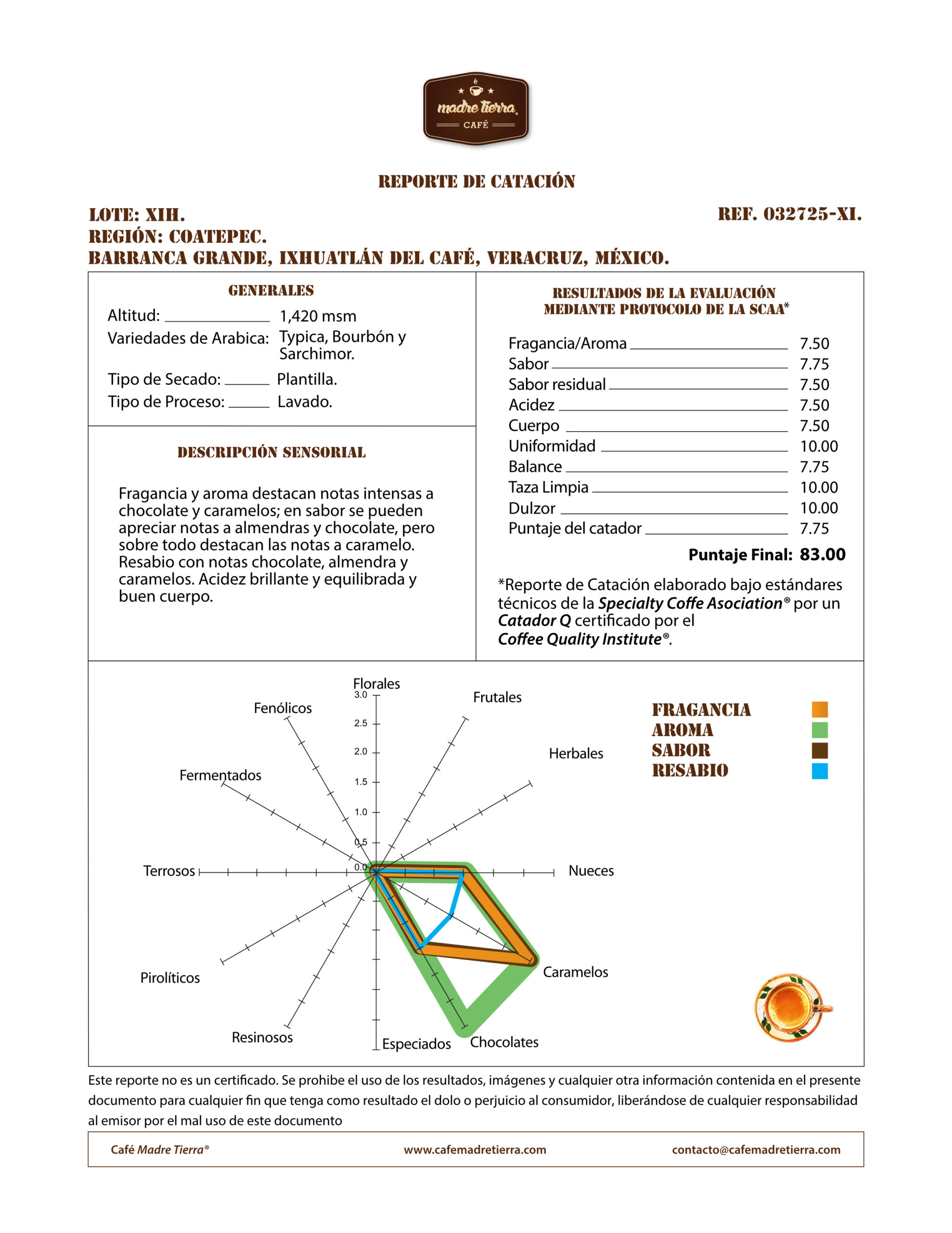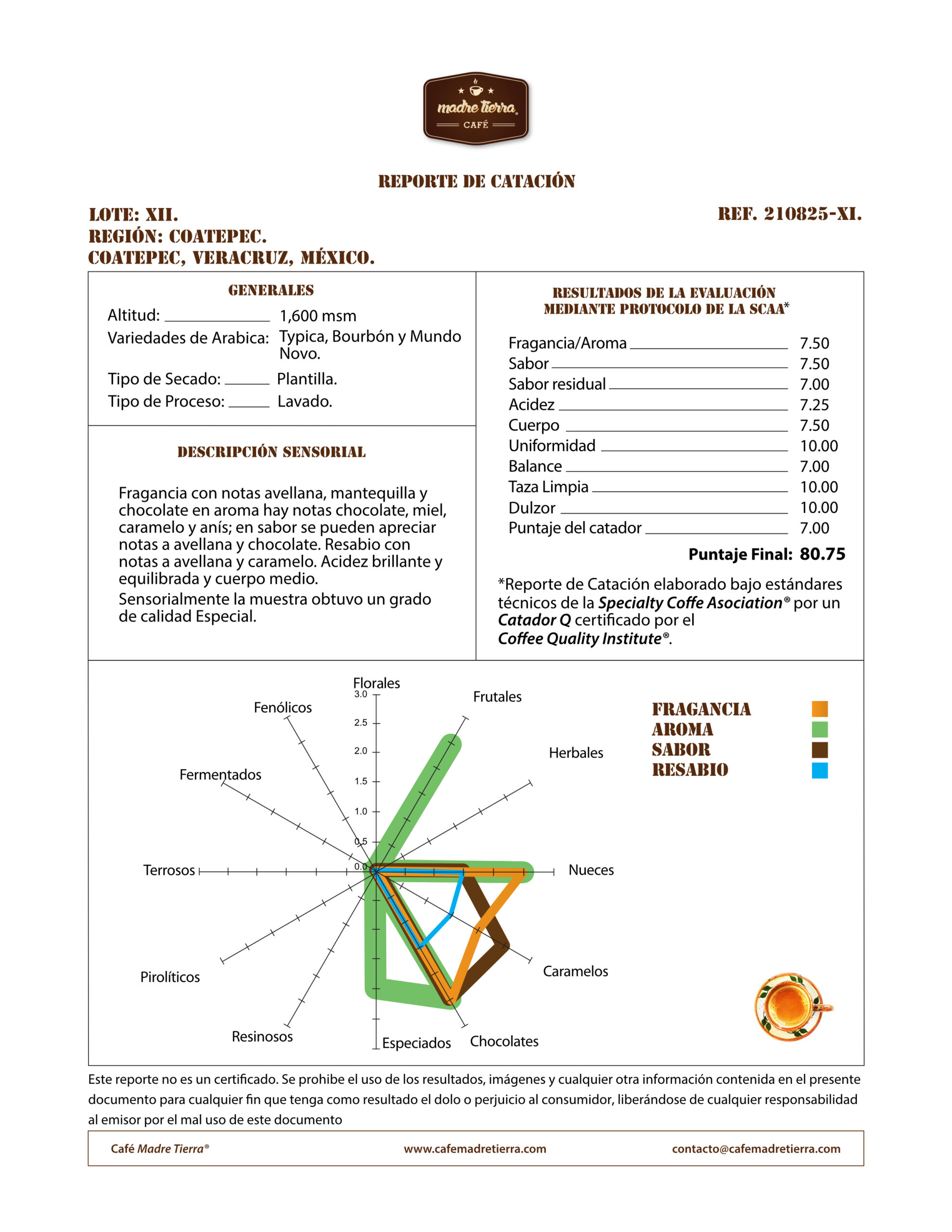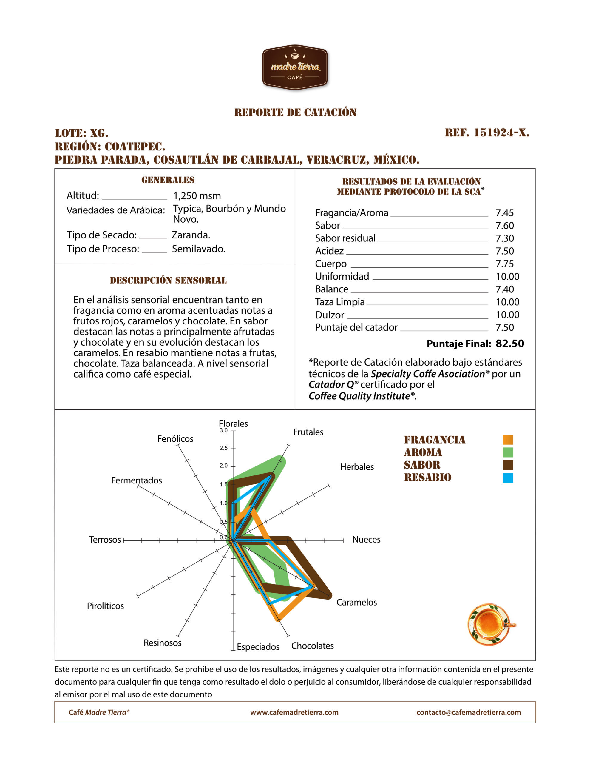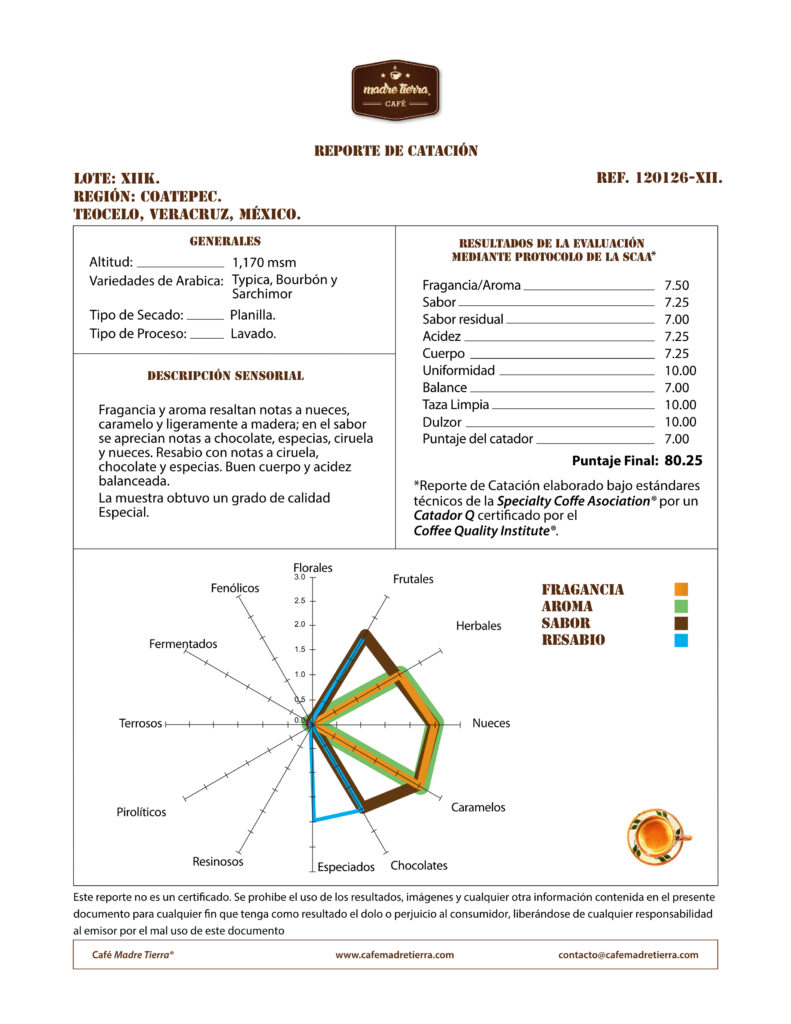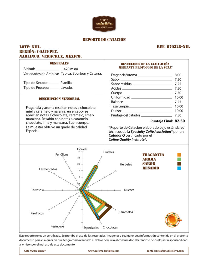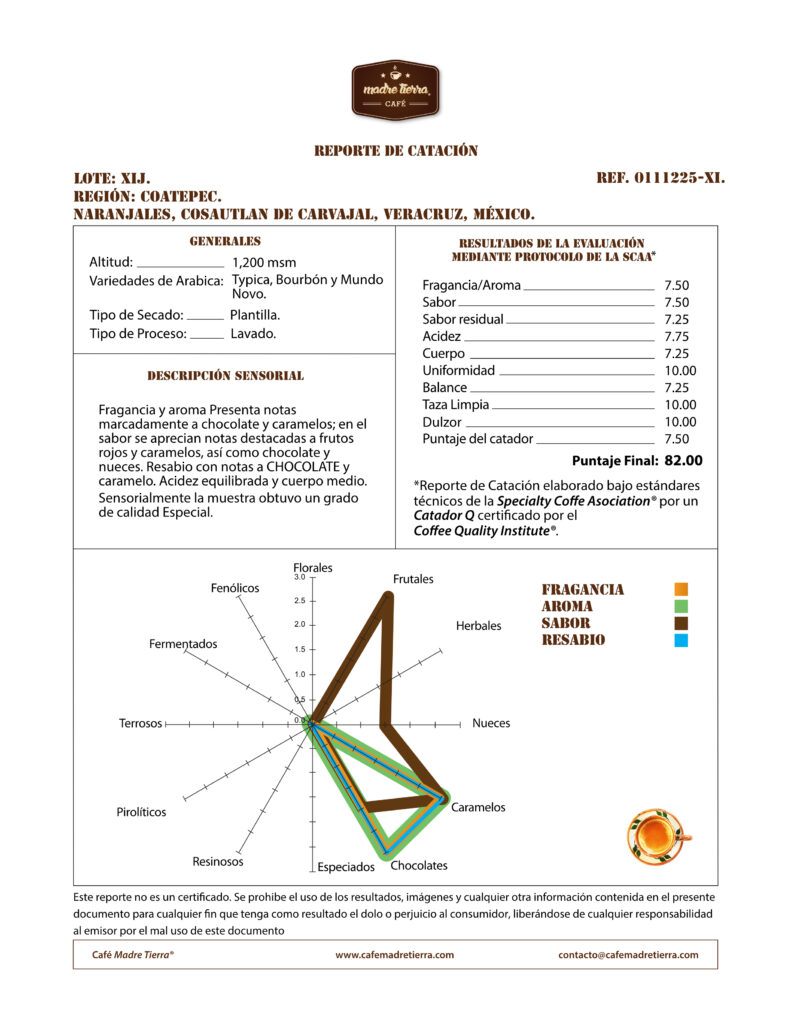 En la parte trasera de tu empaque de Café Madre Tierra® podrás ver una etiqueta con la Fecha de Caducidad y el Lote. Busca abajo el Lote correspondiente para ver la calificación que tiene tu café, el origen, el perfil de taza y datos interesantes como la altitud de la finca, variedades de arábica, notas destacadas, entre otros. ¡Qué lo disfrutes!